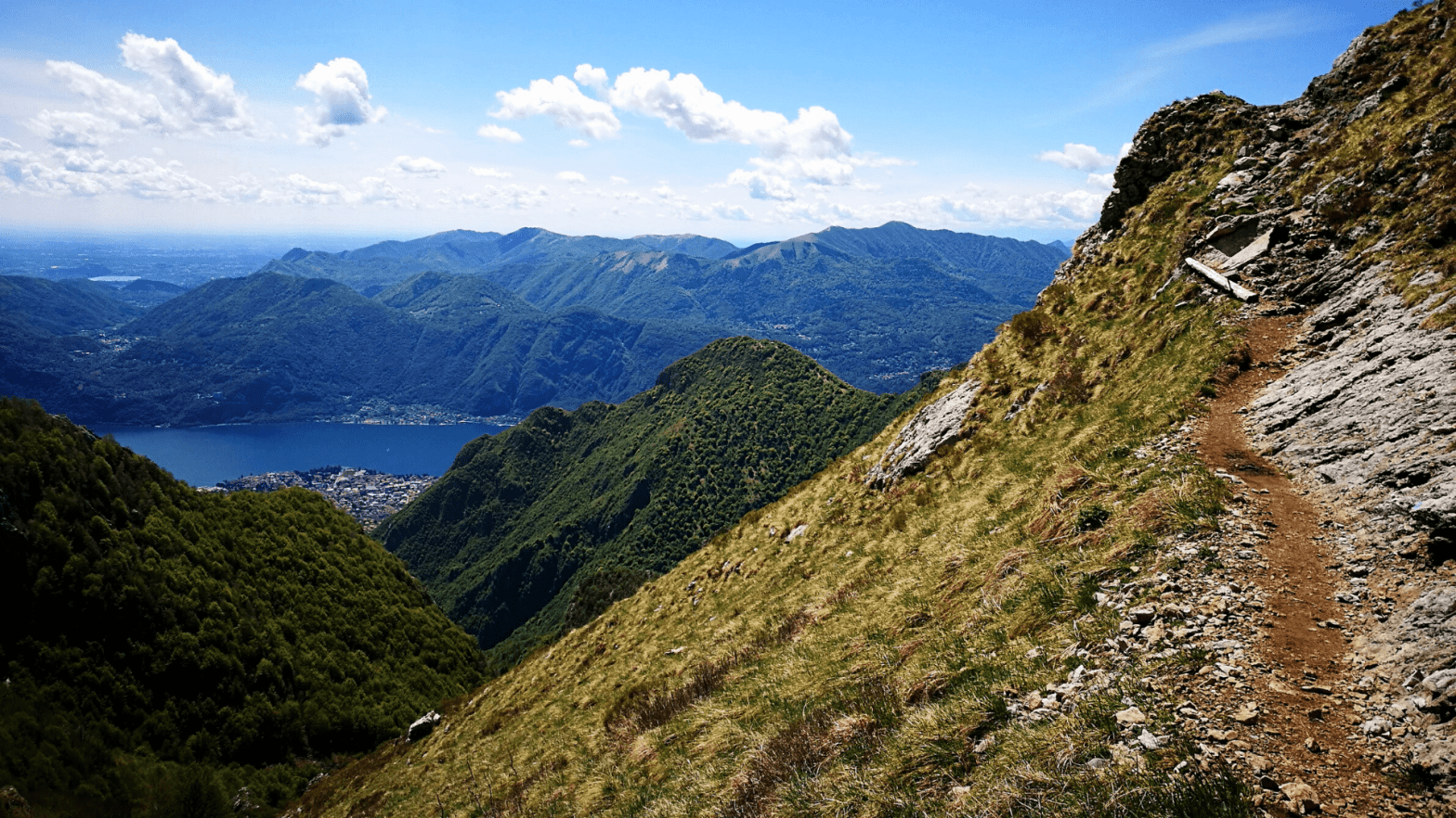 Superata la più ripida salita di tutto l’itinerario, il sentiero prosegue sulla sinistra lungo il crinale della montagna. Da qui il panorama inizia ad aprirsi, concedendoci scorci sul Lago di Como e sulle diverse cime che lo circondano.