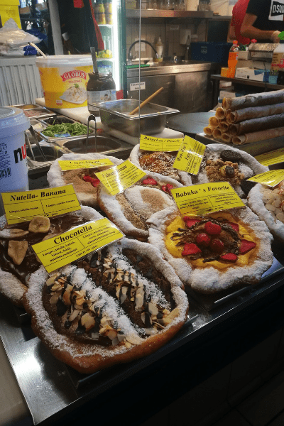 Per quanto riguarda il pranzo, la scelta è ricaduta su alcuni piccoli chioschi sparsi qua e là per Budapest. Senza mai farsi mancare il kürtőskalács il dolce tipico ungherese conosciuto anche come camino dolce o torta a camino per la sua forma.