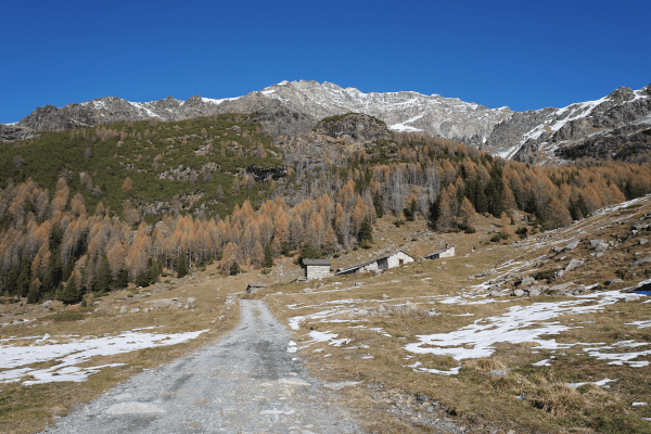 Procedendo, arriverai poi ad un bivio. In questo caso devi tenere la sinistra, e oltrepassare la sbarra che segna l’inizio dell’area di cava. Da questo punto, ancora poche centinaia di metri, e arriverai alla bellissima e isolata Alpe Fora a 2053 metri di altitudine.
