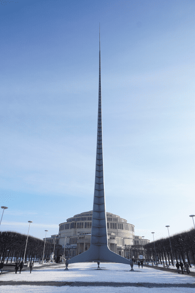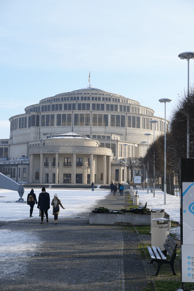 Davanti alla Sala del Centenario svetta l’Iglica, una scultura in metallo eretta nel 1948 per simboleggiare le conquiste della Polonia comunista.